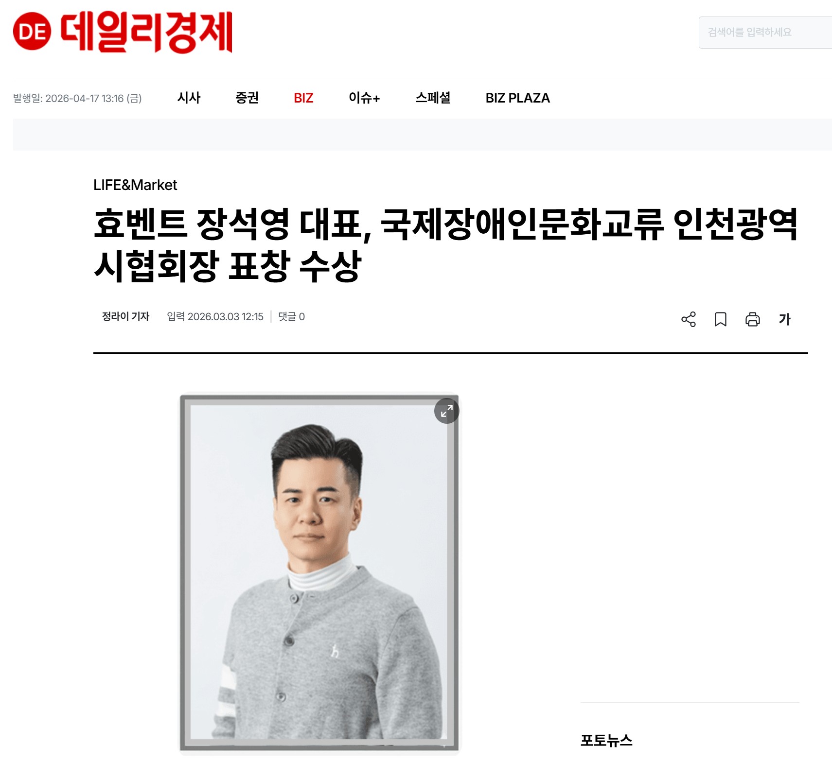 효벤트 장석영 대표, 국제장애인문화교류 인천광역시협회장 표창 수상